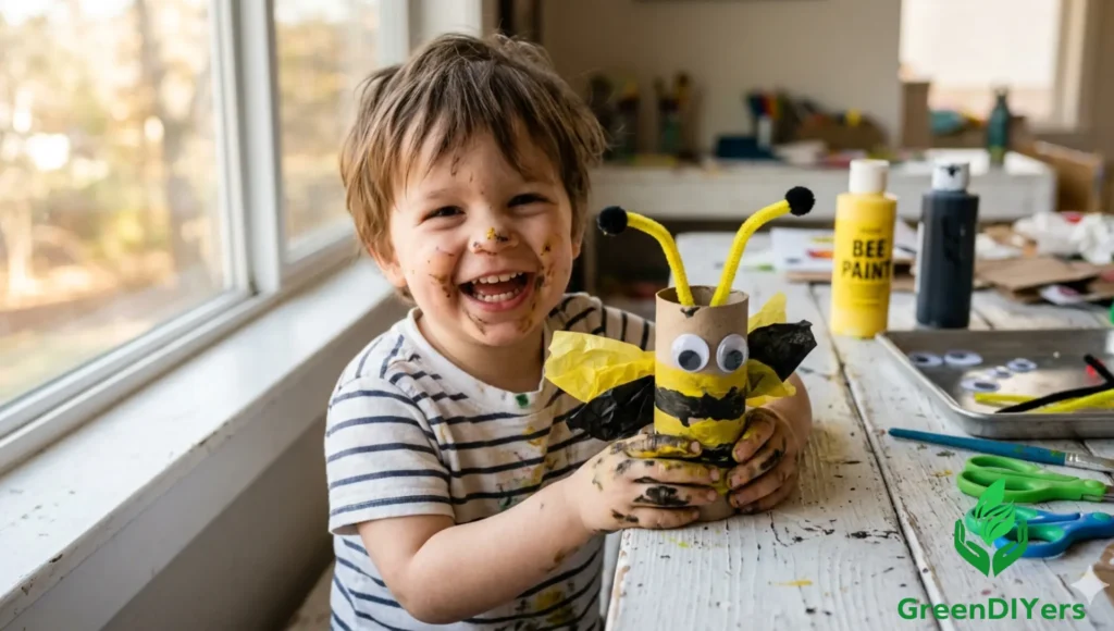 Follow the step-by-step guide above! In short: paint the roll yellow, add black stripes, attach white wings cut from tissue paper, glue on googly eyes, and poke pipe cleaners through the top for antennae. It’s one of the most satisfying recycled bee crafts out there โ and the finished result looks great displayed on a shelf or windowsill.