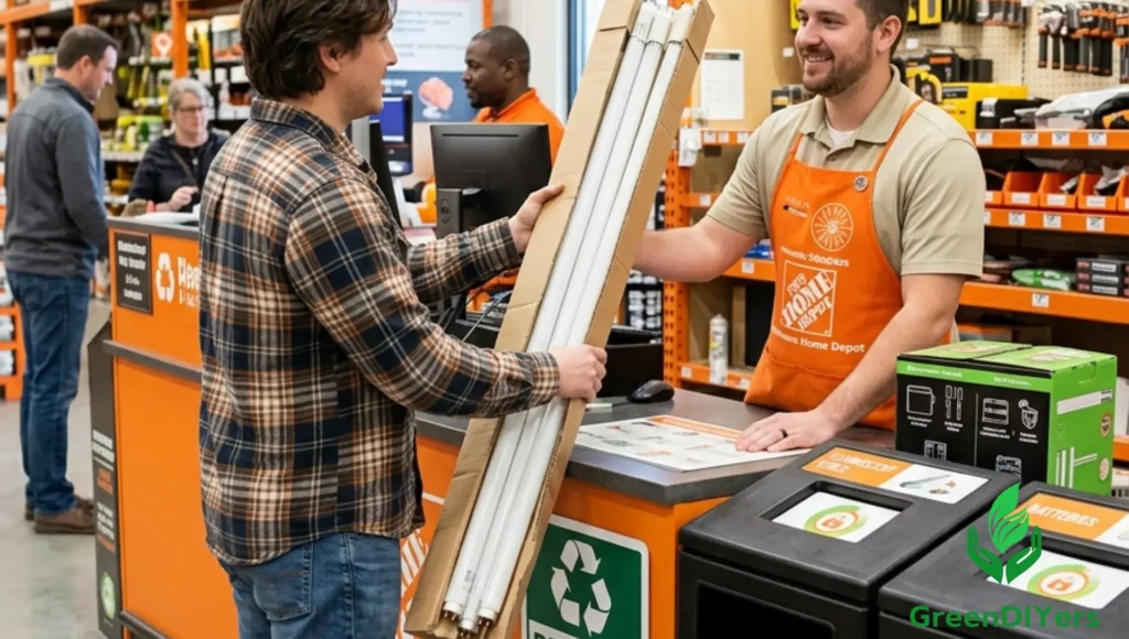 Does Home Depot recycle 4ft fluorescent tubes? In many locations, yes — Home Depot accepts 4-foot linear fluorescent tubes through their in-store recycling program. However, this varies by store. The safest bet is to call your local branch before making the trip, or check their recycling page online. They reliably accept CFLs nationwide.